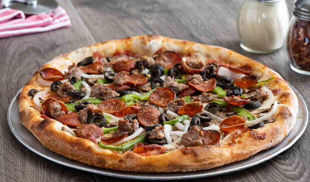 Delicious pizza topped with pepperoni, sausage, bell peppers, onions, olives, and mushrooms. Get it for yourself or share with a friend!